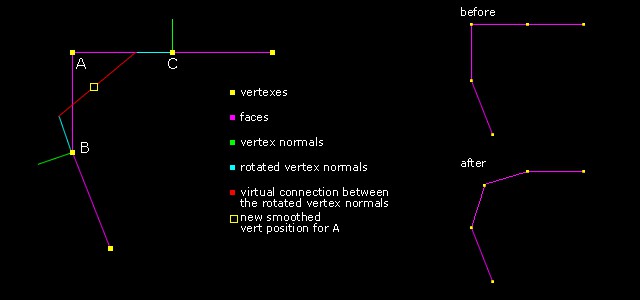 I’ll explain the concept in 2D. Lets say we want to smooth the position of vertex A and it’s connected to vertex B and C. Then we get the vertex normals for B and C. We then rotate those normal vectors 90 degrees towards A and make them half the length of the distance between that specific vert (B or C) and A. Once we have those, we find the points at the ends of those two vectors and place vert A at the midpoint between them.