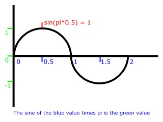 # Get the math module import math # Loop twenty one times (21 because then it starts at 0 and ends with i as 20) for i in range(21): # Make a value between 0.0 and 2.0 x = i * 0.1 # Get the y value y = math.sin(math.pi * x) # Print it out print(y)