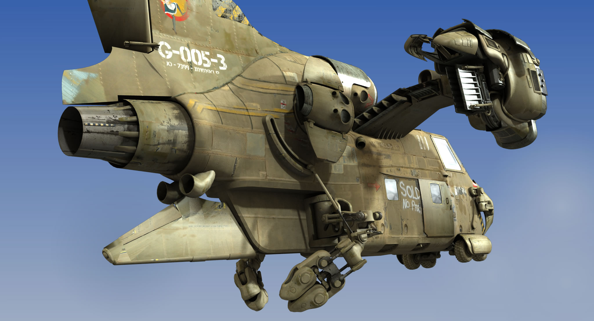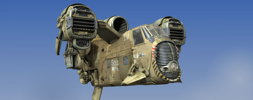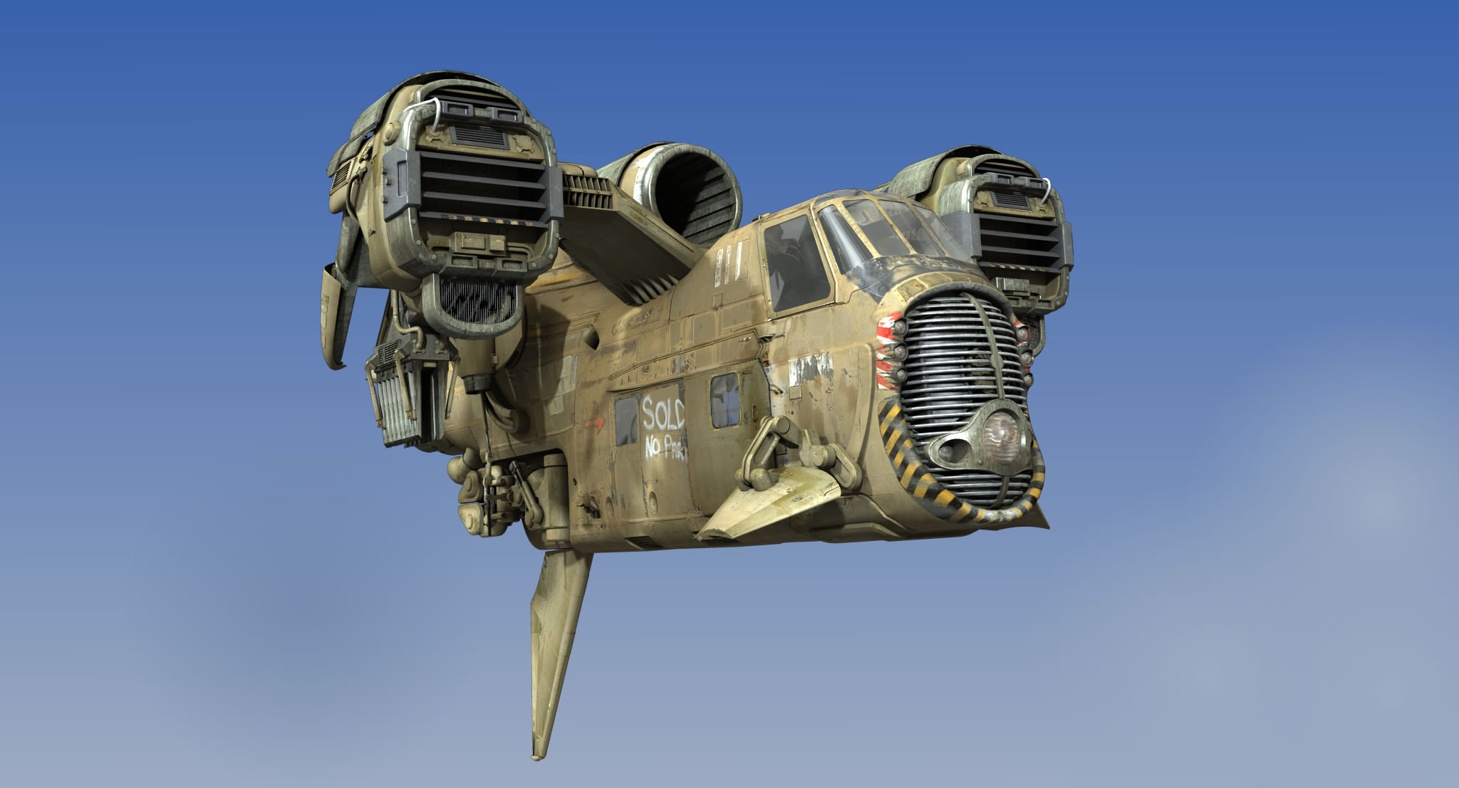 For the motion picture Project London I created the Goose... In part the ship was based on the frame of an existing helicopter. That way the actors could be shot around the machine... then I added a heap of parts around it... but kept it so that it could be easily inserted into the film shots.