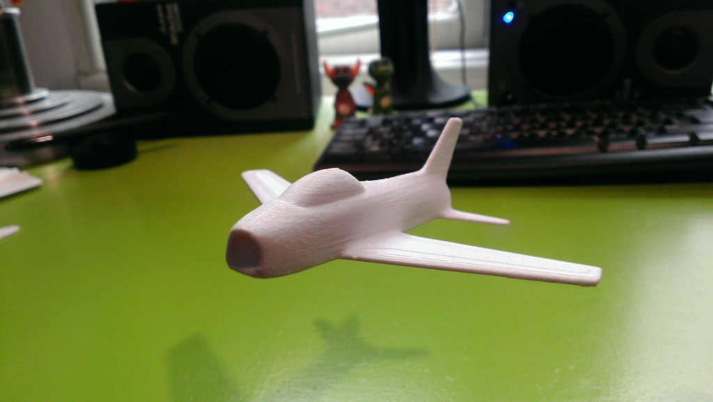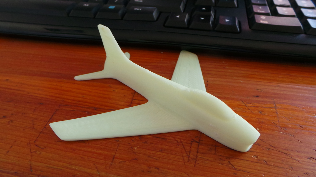After the great response I got on the 'Little Jet Plane' design, I wanted to do a somewhat more realistic fighter. The one that came to mind was the F86 Sabre... because it's wings are at the bottom of the fussilage, and they're horizontal. This means they can rest on the bed of your 3D printer. Mind you... this is not a realistic Sabre, but my loose interpretation of it.