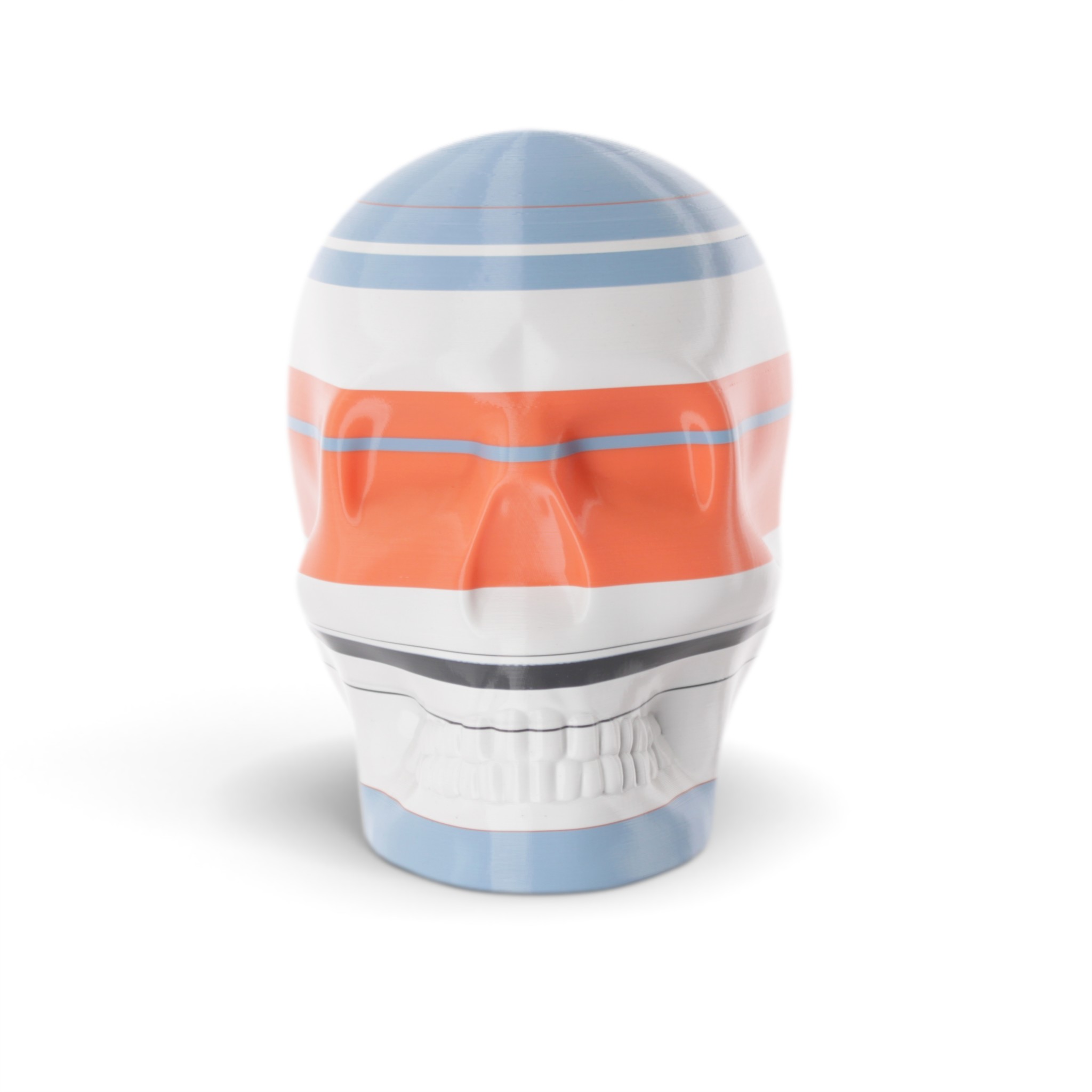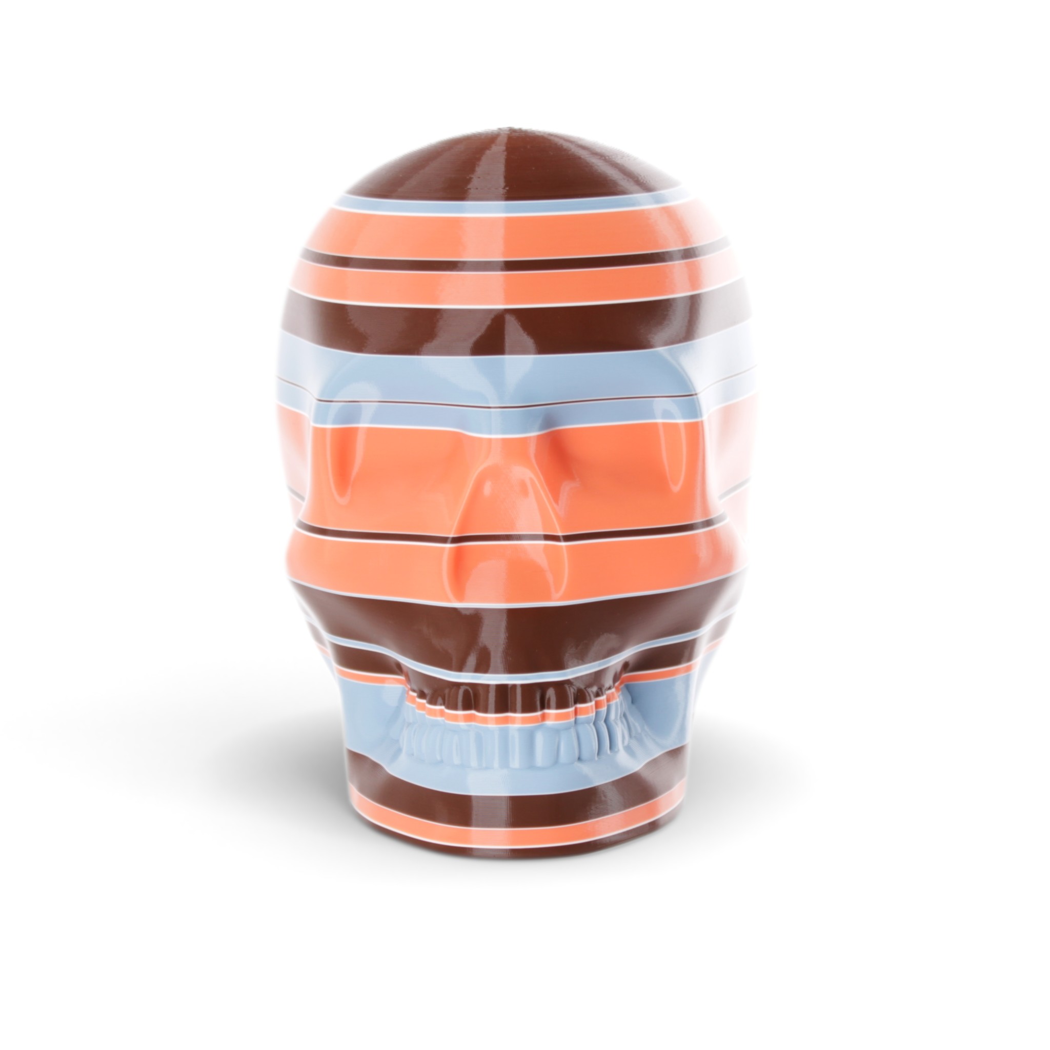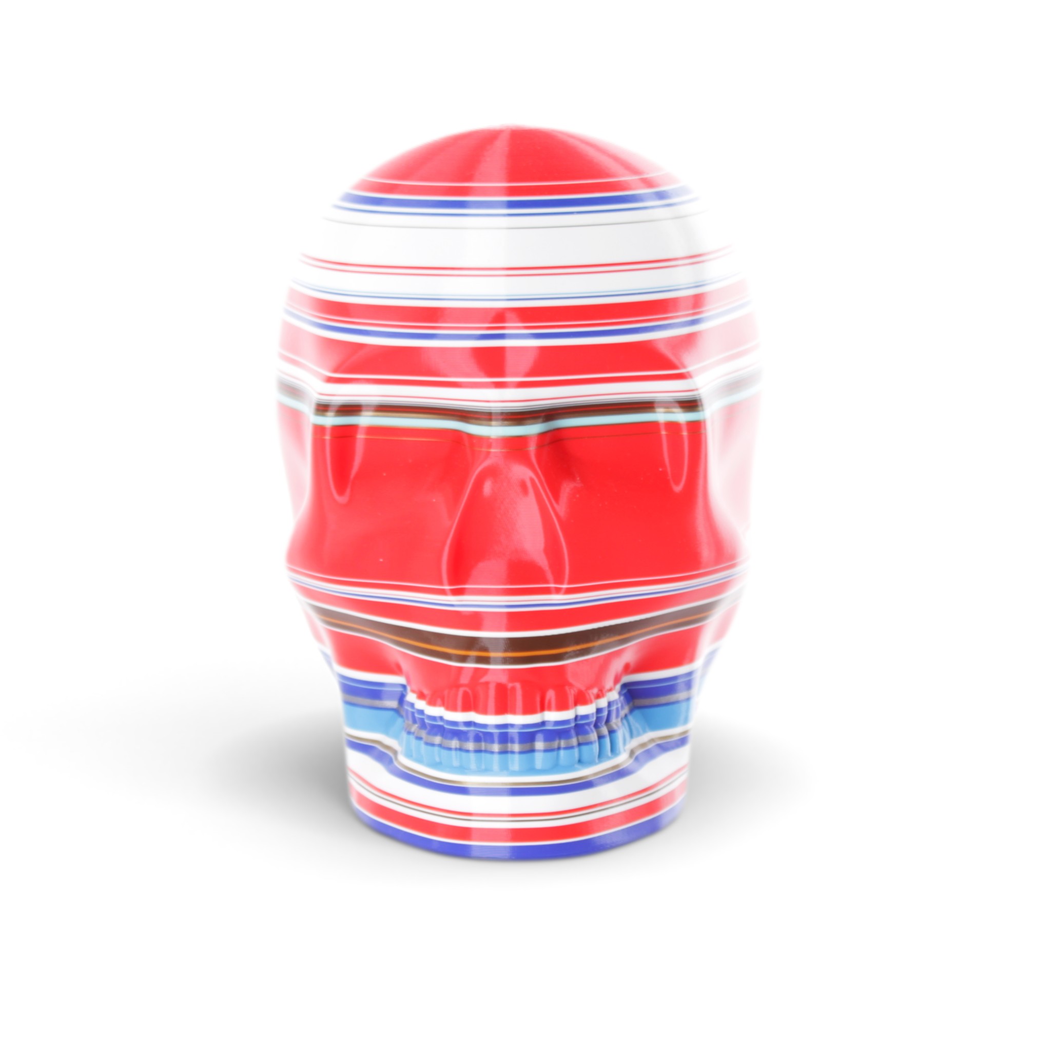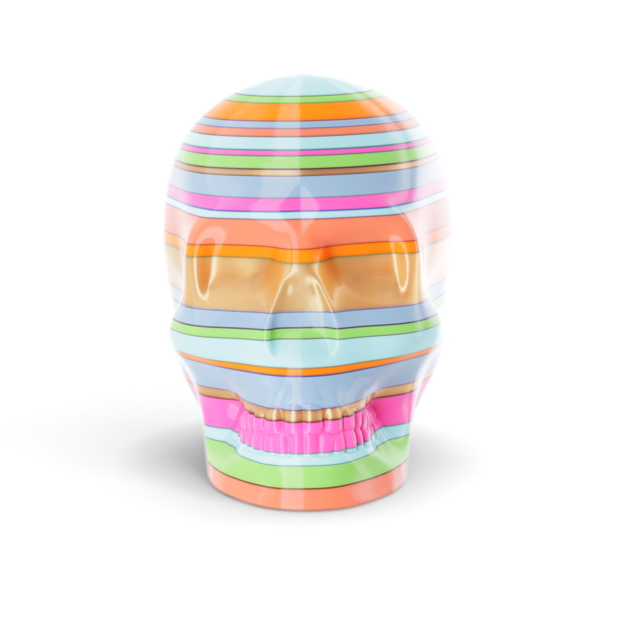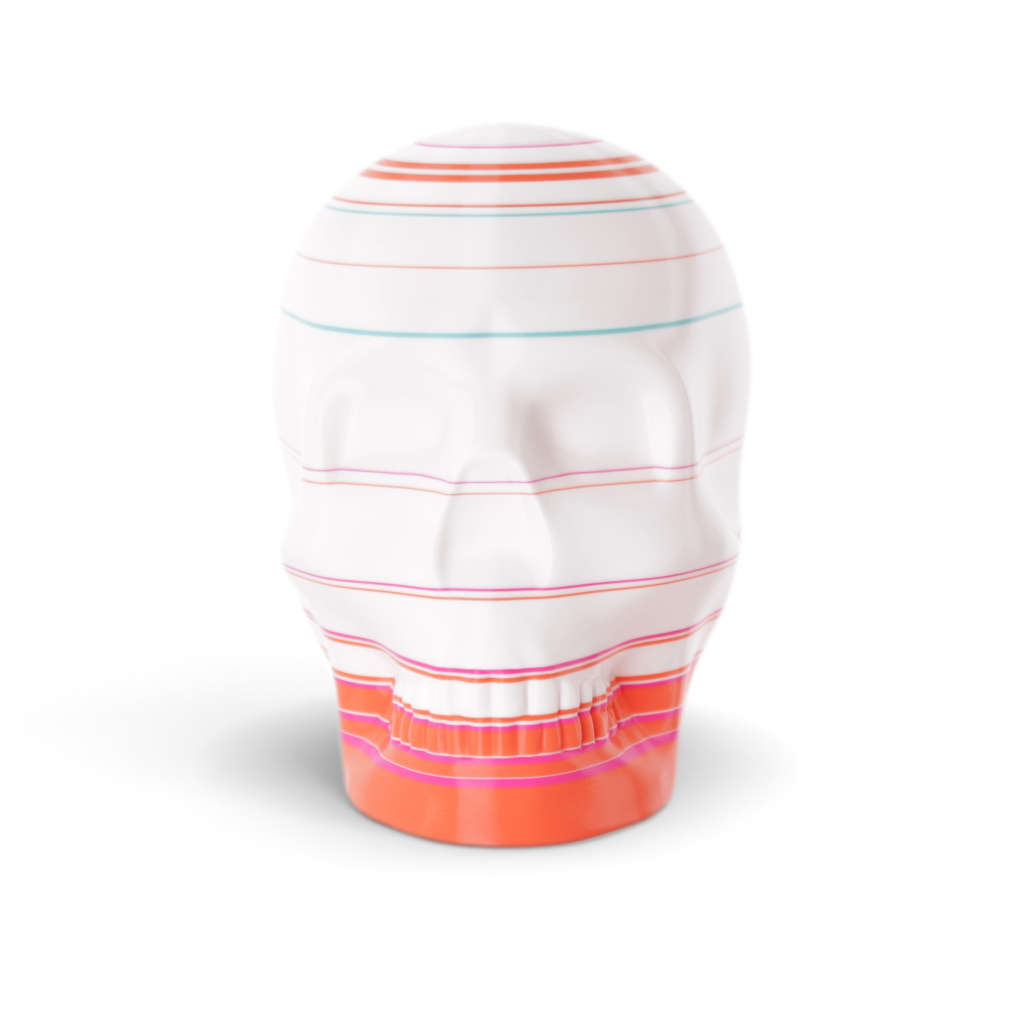 The shape in this series is a constant. Like the cups manufactured in the industrial age... they are all the same. Except with 3D printing we can customise and make every object unique... the skulls all have one of a kind colour patterns manually inserted in the 3D printing process.
