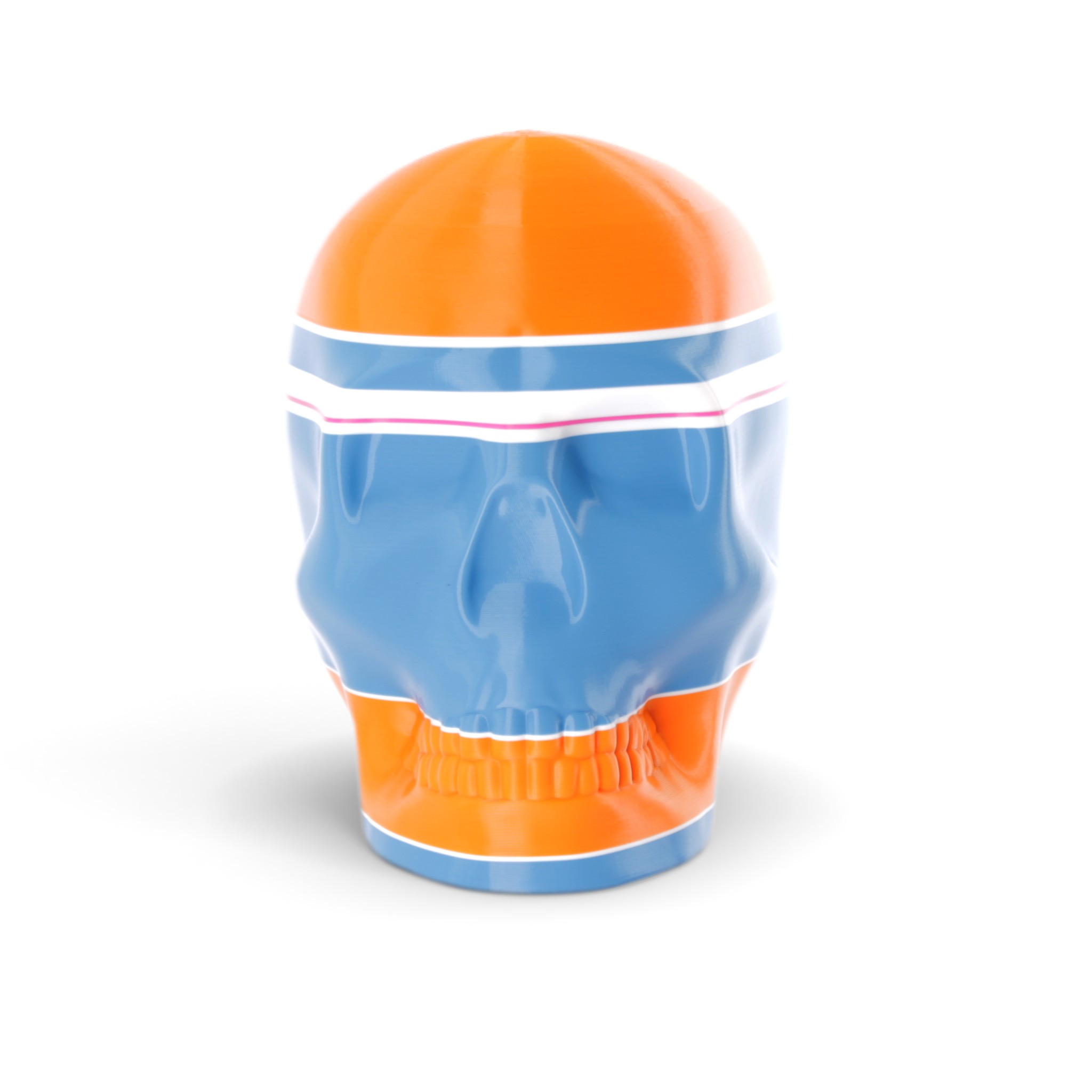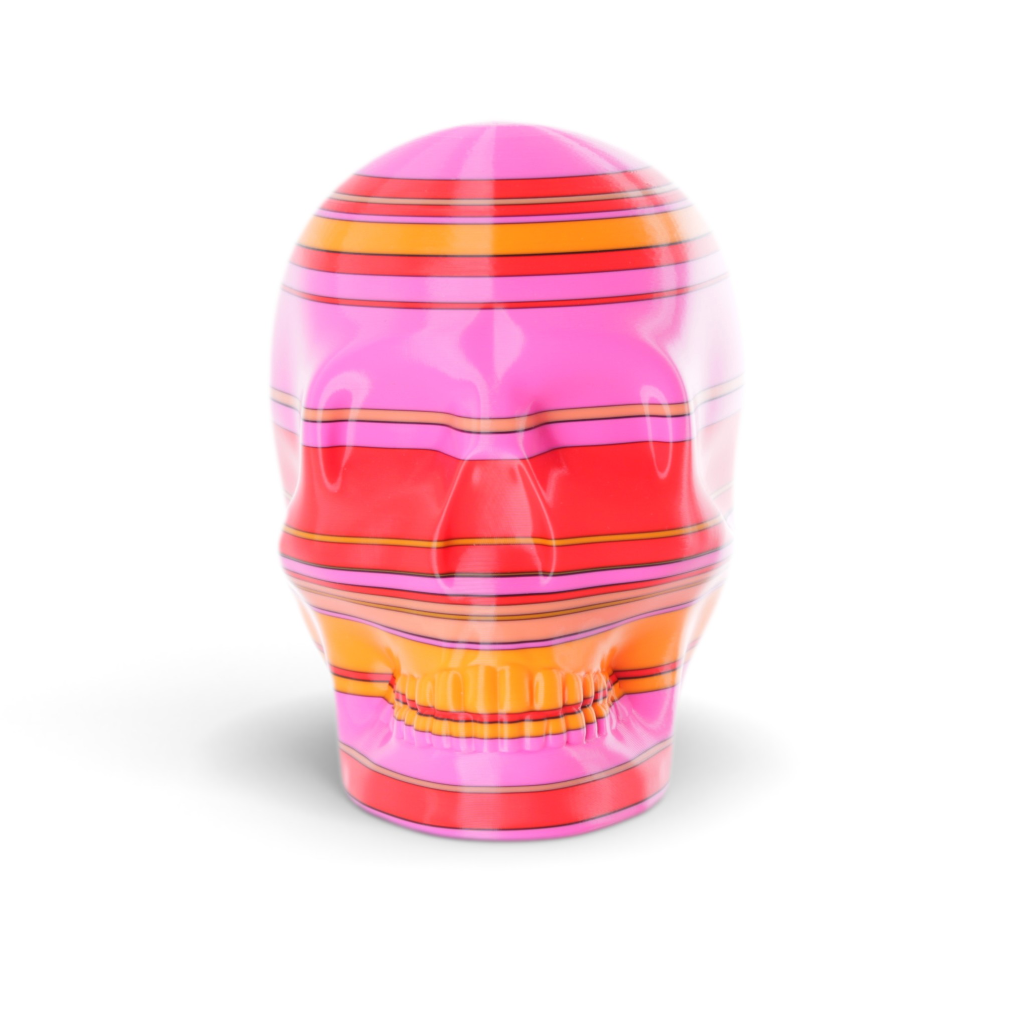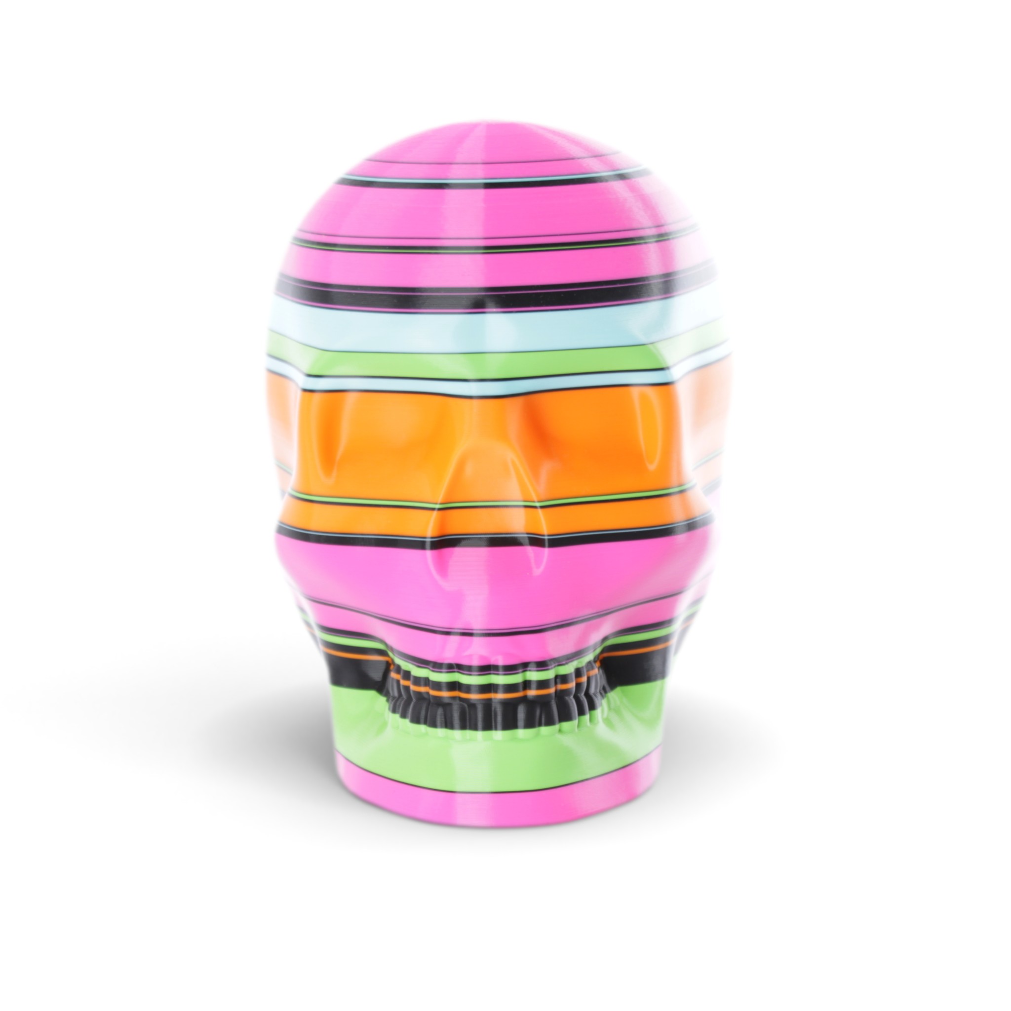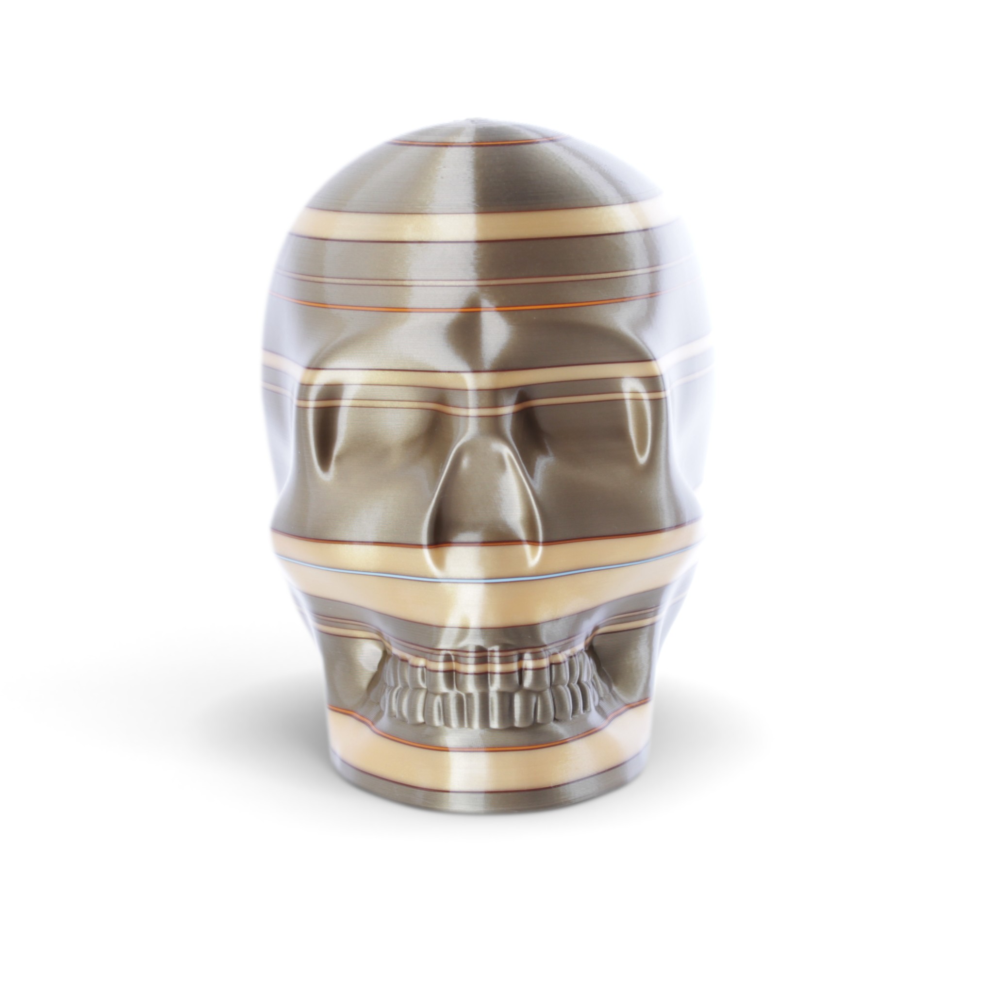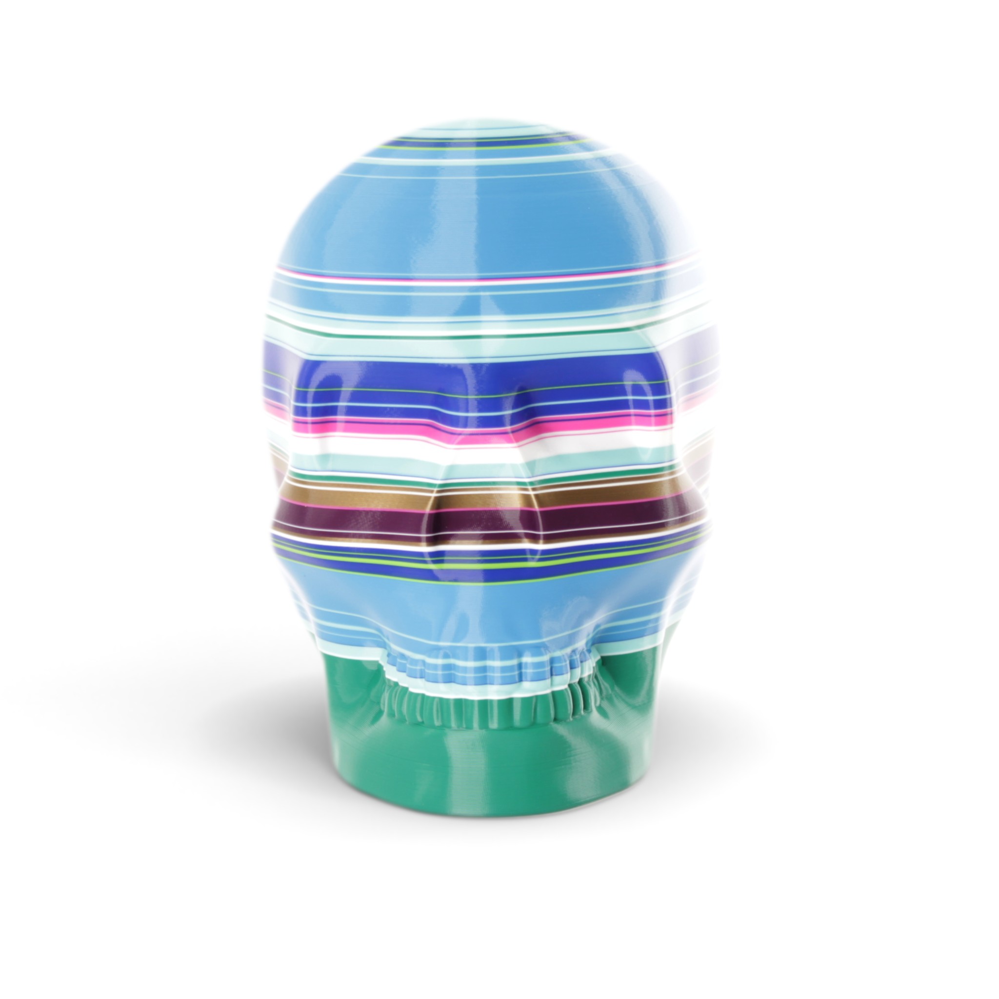 The shape in this series is a constant. Like the cups manufactured in the industrial age... they are all the same. Except with 3D printing we can customise and make every object unique... the skulls all have one of a kind colour patterns manually inserted in the 3D printing process.