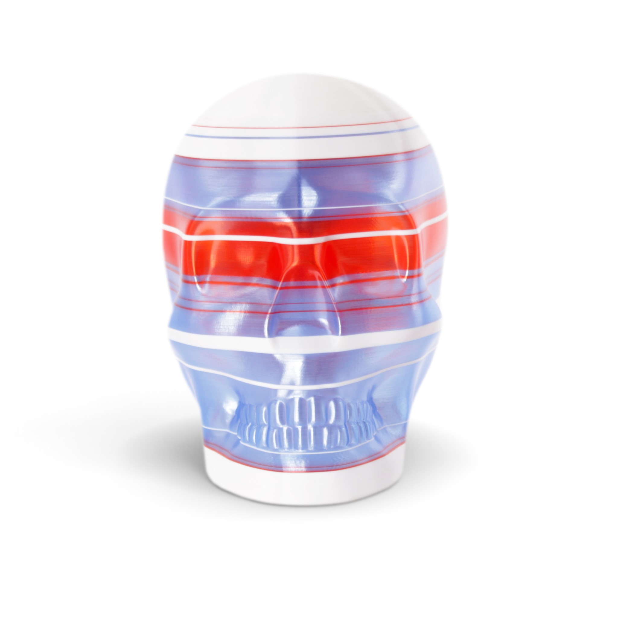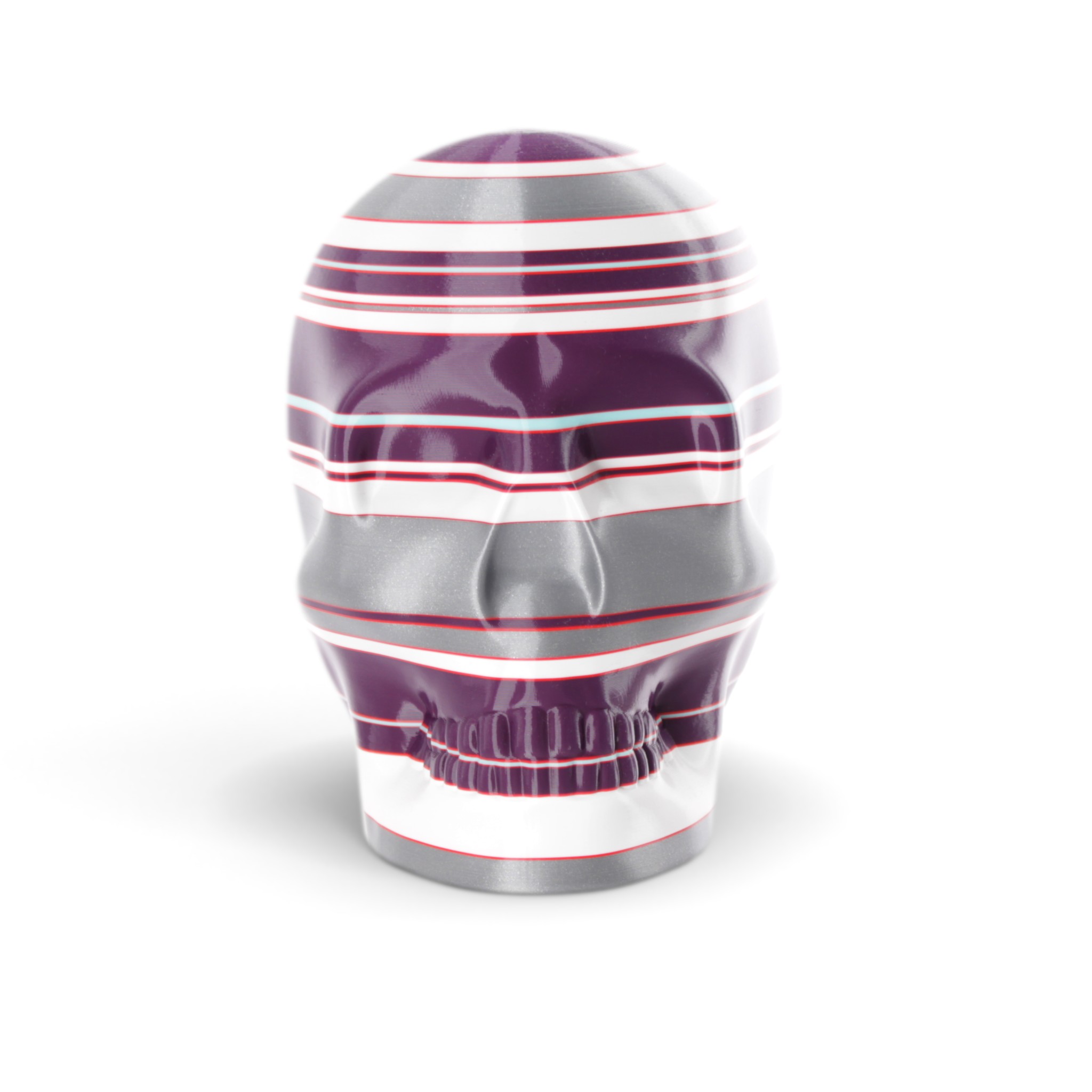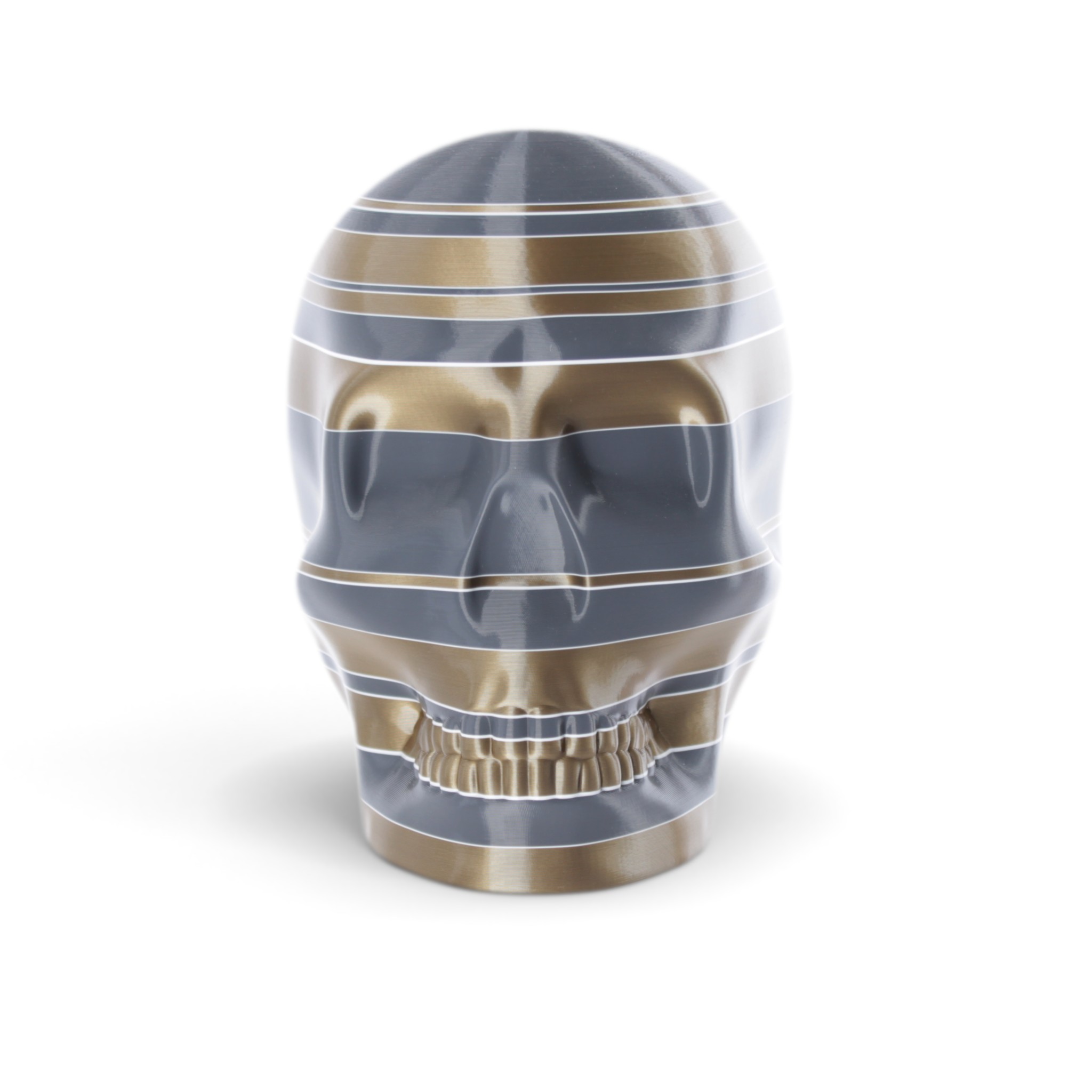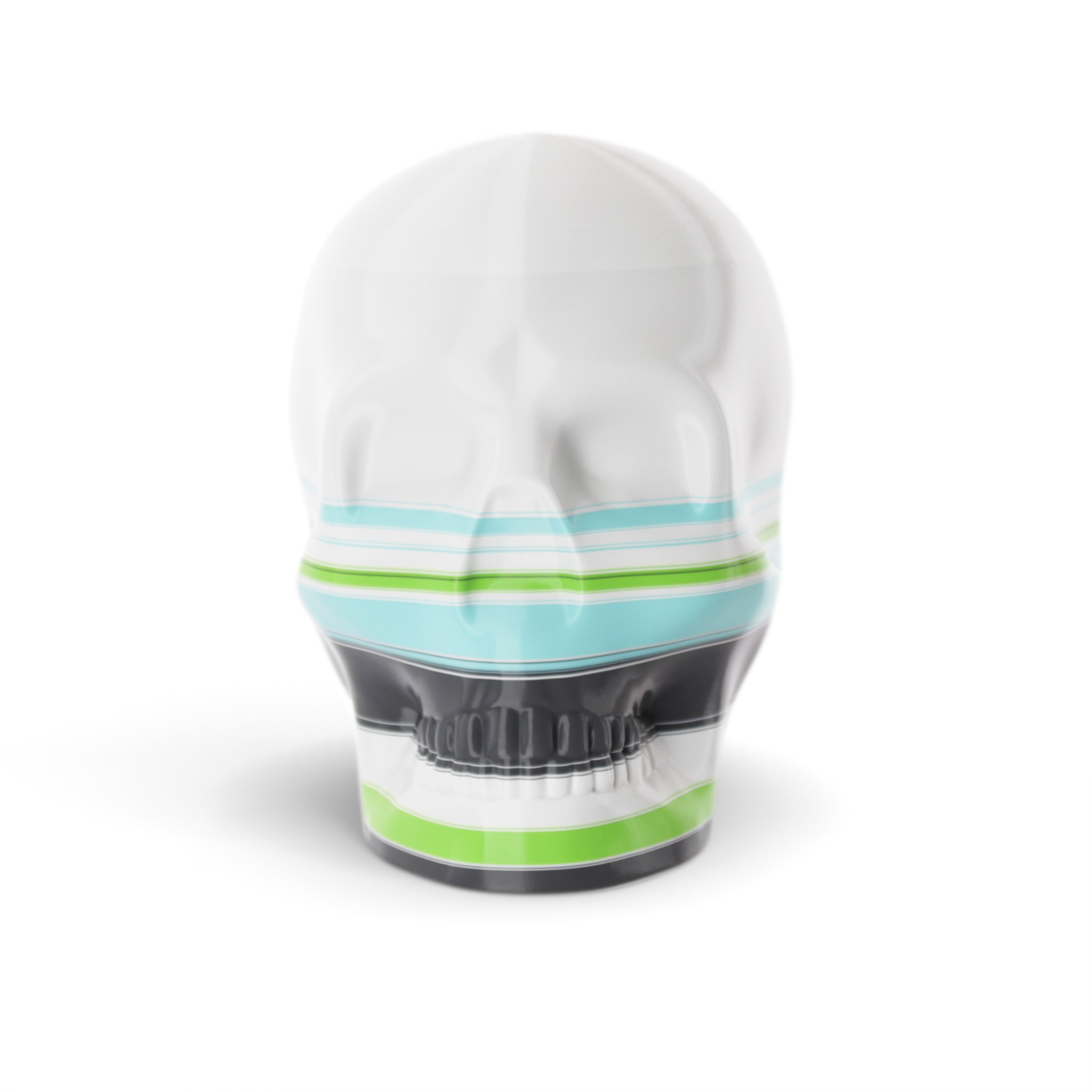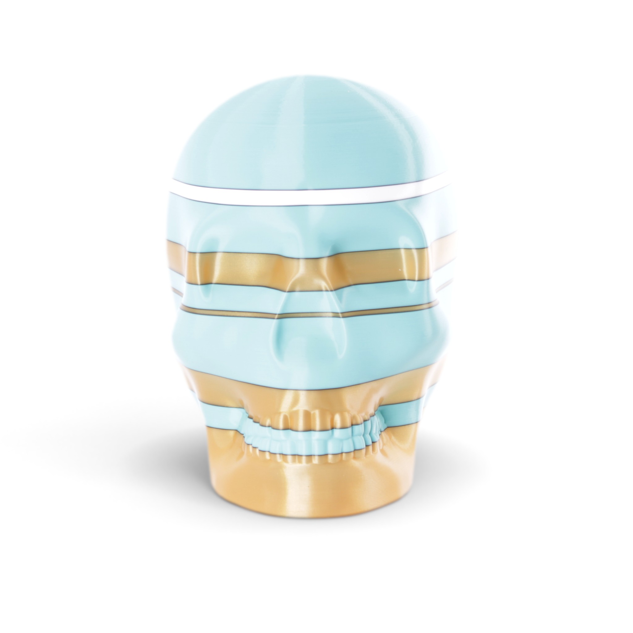 The shape in this series is a constant. Like the cups manufactured in the industrial age... they are all the same. Except with 3D printing we can customise and make every object unique... the skulls all have one of a kind colour patterns manually inserted in the 3D printing process.